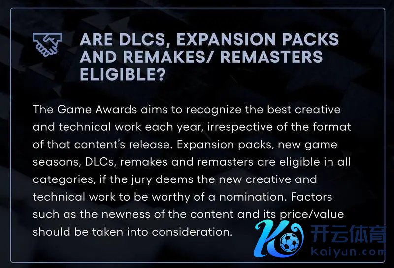 扬子晚报/紫牛新闻记者在TGA官网提防到,原文暗示,游戏大奖旨在赏赐每年最好的创意和期间作品,不管内容以何种表情发布。要是评审团觉得新的创意和期间作品值得提名,则彭胀包、新游戏赛季、DLC、游戏的重制版和复刻版均有阅历得到所有这个词类别的提名。应试虑内容的新颖性和价钱/价值等身分。