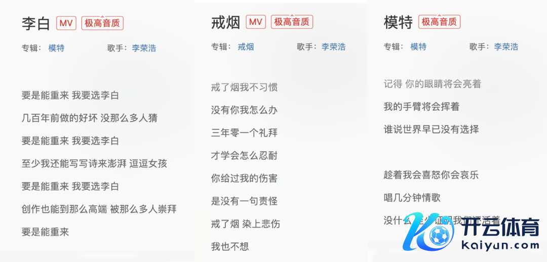 李荣浩三首着名歌曲:《李白》(押ai)、《戒烟》(押an/ai/ang)、《模特》(押e)副歌歌词对比。图源:网易云音乐。上文数据开首见参考而已3