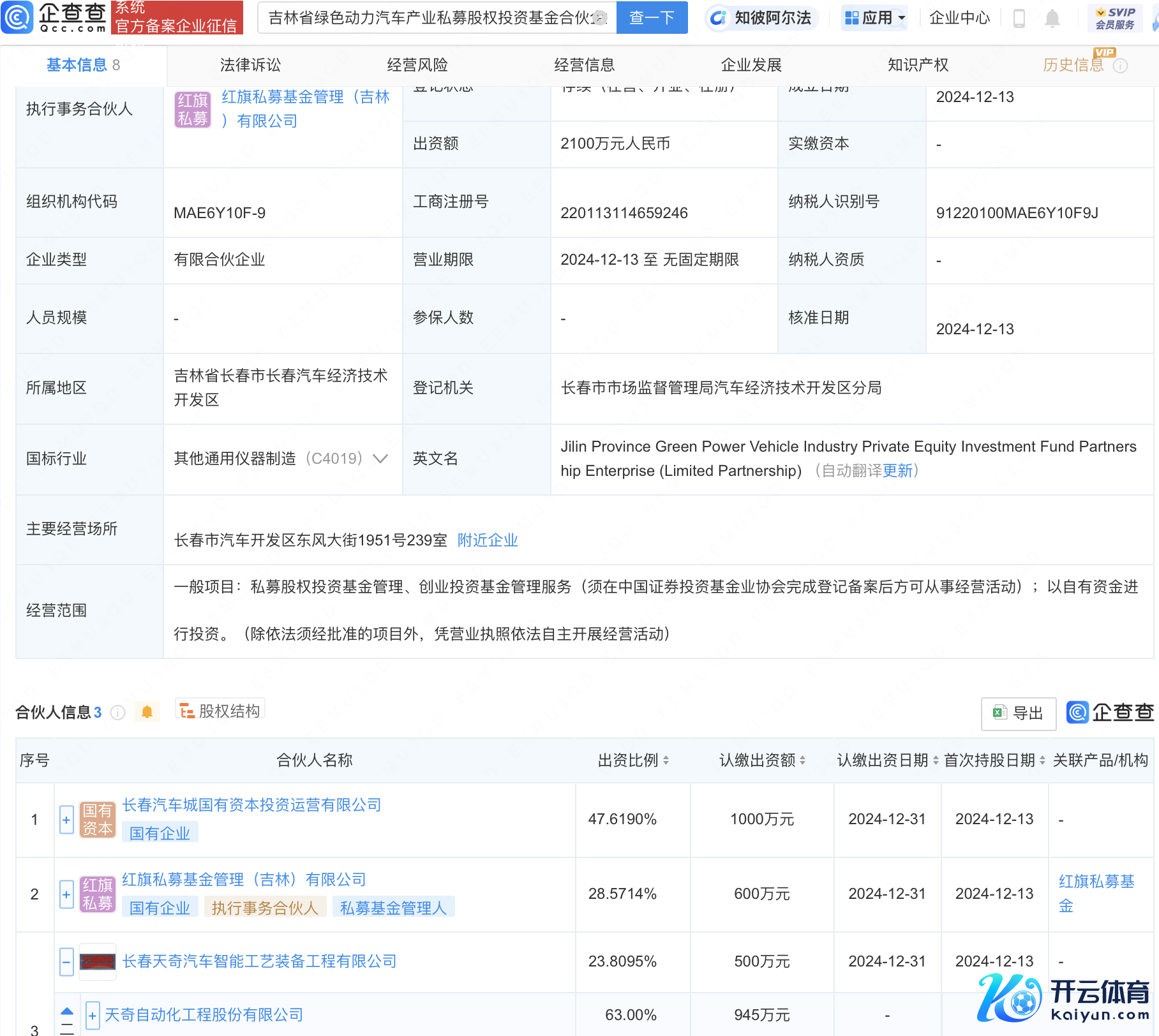 企查查APP知道kaiyun.com,近日,吉林省绿色能源汽车产业私募股权投资基金合股企业(有限合股)建造,出资额2100万元东说念主民币,磋议界限包含:私募股权投资基金处分、创业投资基金处分职业;以自有资金进行投资。企查查股权穿知道出,该企业由天奇股份(002009)旗下长春天奇汽车智能工艺装备工程有限公司、长春汽车城国有老本投资运营有限公司、红旗私募基金处分(吉林)有限公司共同捏股。