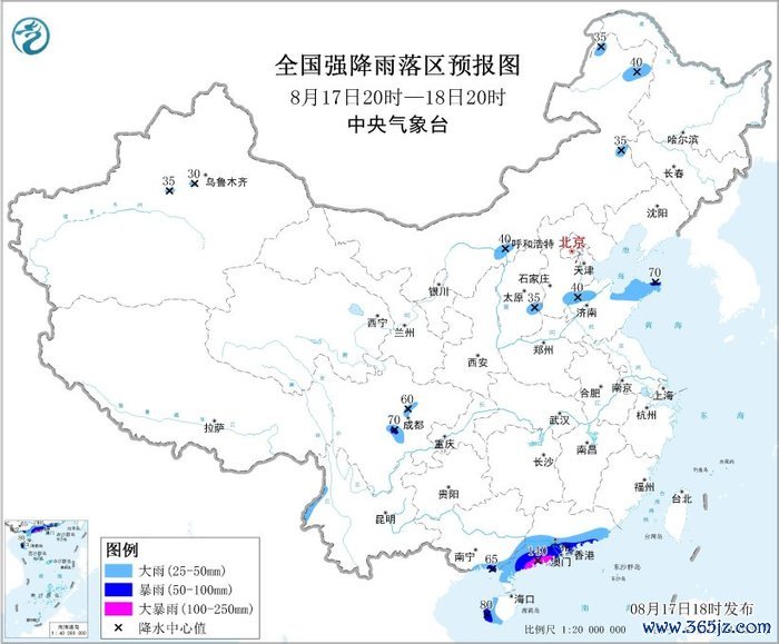 中央局势台8月17日18时无间发布暴雨蓝色预警: